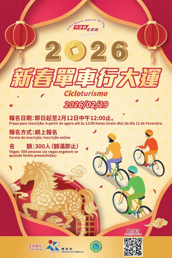 由體育局與中國澳門單車總會合辦的「新春單車行大運」,將於農曆正月初三(2月19日)舉行。活動對象為1956年或之後出生,且具備基本騎行經驗者。2012年或之後出生之參加者須由家長或監護人全程陪同。名額共300個,額滿即止。參加者須於活動當日上午8時30分,前往奧林匹克體育中心三人籃球場側空地集合,並於9時正出發。騎行路線貫穿氹仔及路環,全程約20公里。參加者務必自備單車及安全帽,且全程配戴,單車不得載人。有意參加者可於即日起至2月12日中午12時,透過大會報名平台(https://buy.gooutmall.com/LNYcycling)進行網上報名,每次最多可報4人。歡迎家長帶同子女參與,共享騎行樂趣。