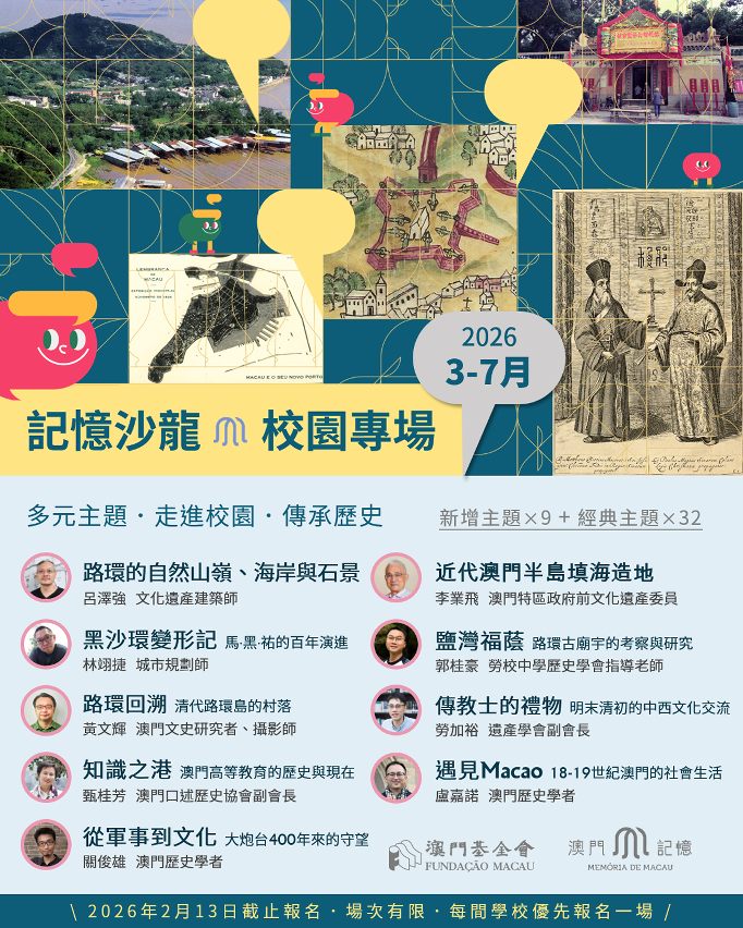 由澳門基金會主辦的“記憶沙龍”校園專場(中學場),致力向本澳中學生傳播澳門在地歷史文化,探索小城在地歷史及社會脈絡,推廣澳門形象。2026年的校園專場講座將於3月至7月期間舉辦,現正開始接受報名,歡迎本澳學校組織參加。
