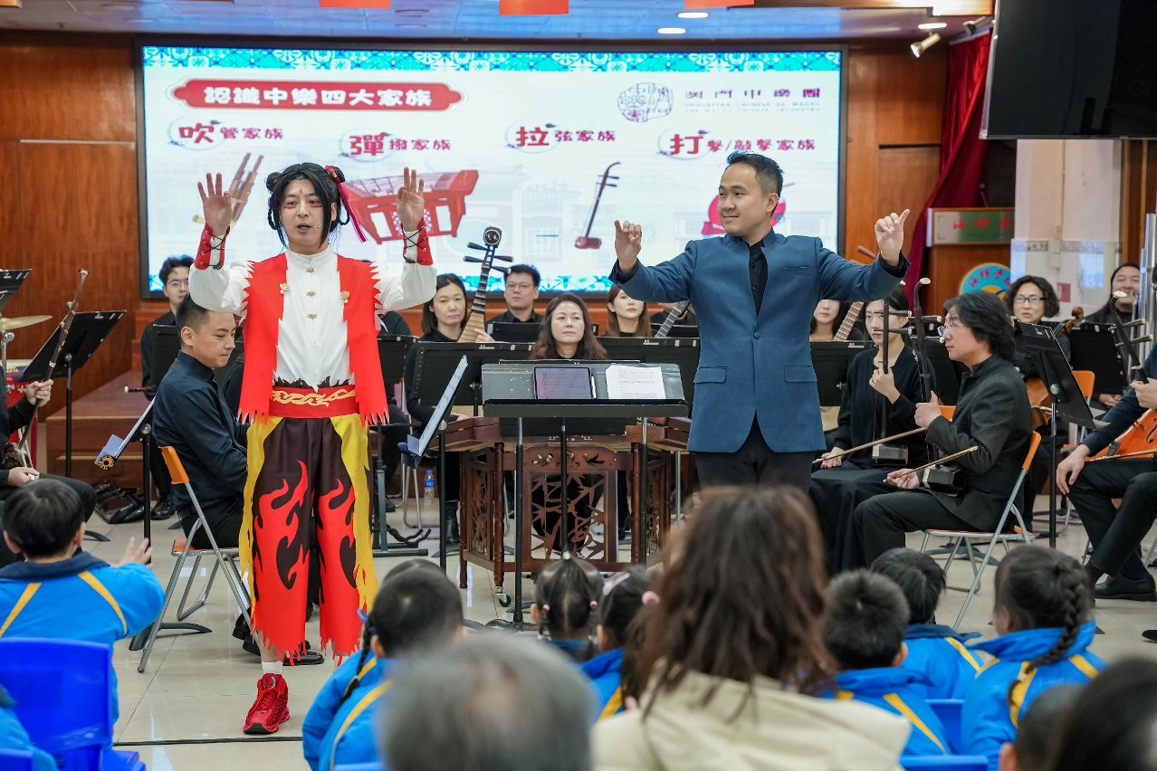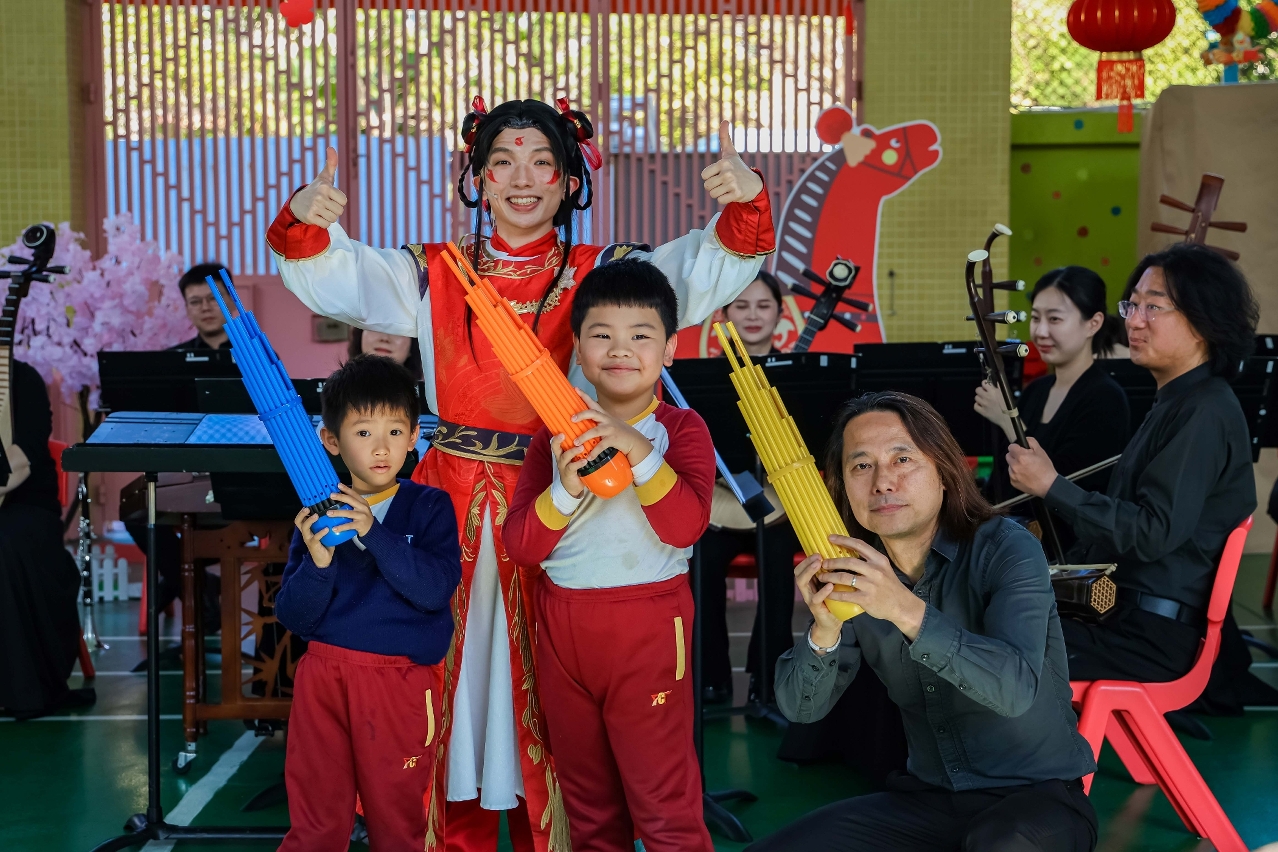 演出以哪吒三太子與哮天犬的故事為主軸,巧妙融合中樂“吹、彈、拉、打”四個聲部的音樂知識,並在駐團指揮廖元鈺的帶領下,呈獻《Golden》《多啦A夢》等耳熟能詳的兒歌,以及《鳳陽花鼓》《步步高》《賽馬》等富有中樂傳統特色的樂曲。小朋友在互動環節中試玩樂器,親身感受中國傳統樂器的趣味,現場氣氛歡快熱鬧,深受師生喜愛。此外,樂團向每位小朋友贈送中國樂器填色紙,鼓勵幼童發揮創意,並藉此進一步加強對中樂的認識與興趣。