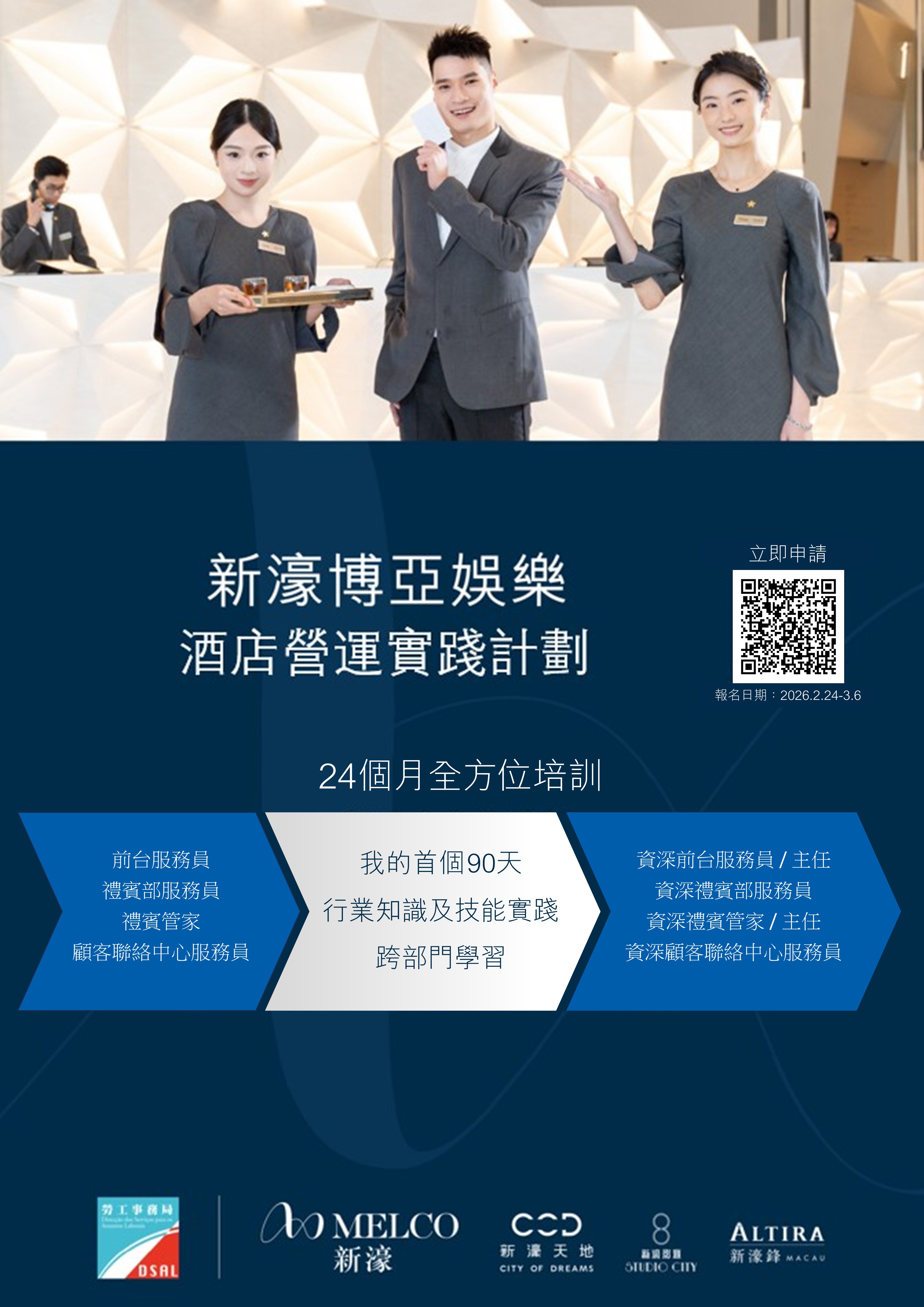 該計劃提供合共62個職位空缺,包括15個“前台服務員"職位空缺、2個“禮賓部服務員"職位空缺、5個“顧客聯絡中心服務員"職位空缺及40個“禮賓管家"職位空缺。獲計劃錄取的參加者,新濠博亞將安排24個月的專業培訓及工作實踐。培訓內容包括:酒店知識培訓、前堂服務及營運培訓、跨部門技能學習及安排僱員考取澳門職業技能認可基準(MORS)等。