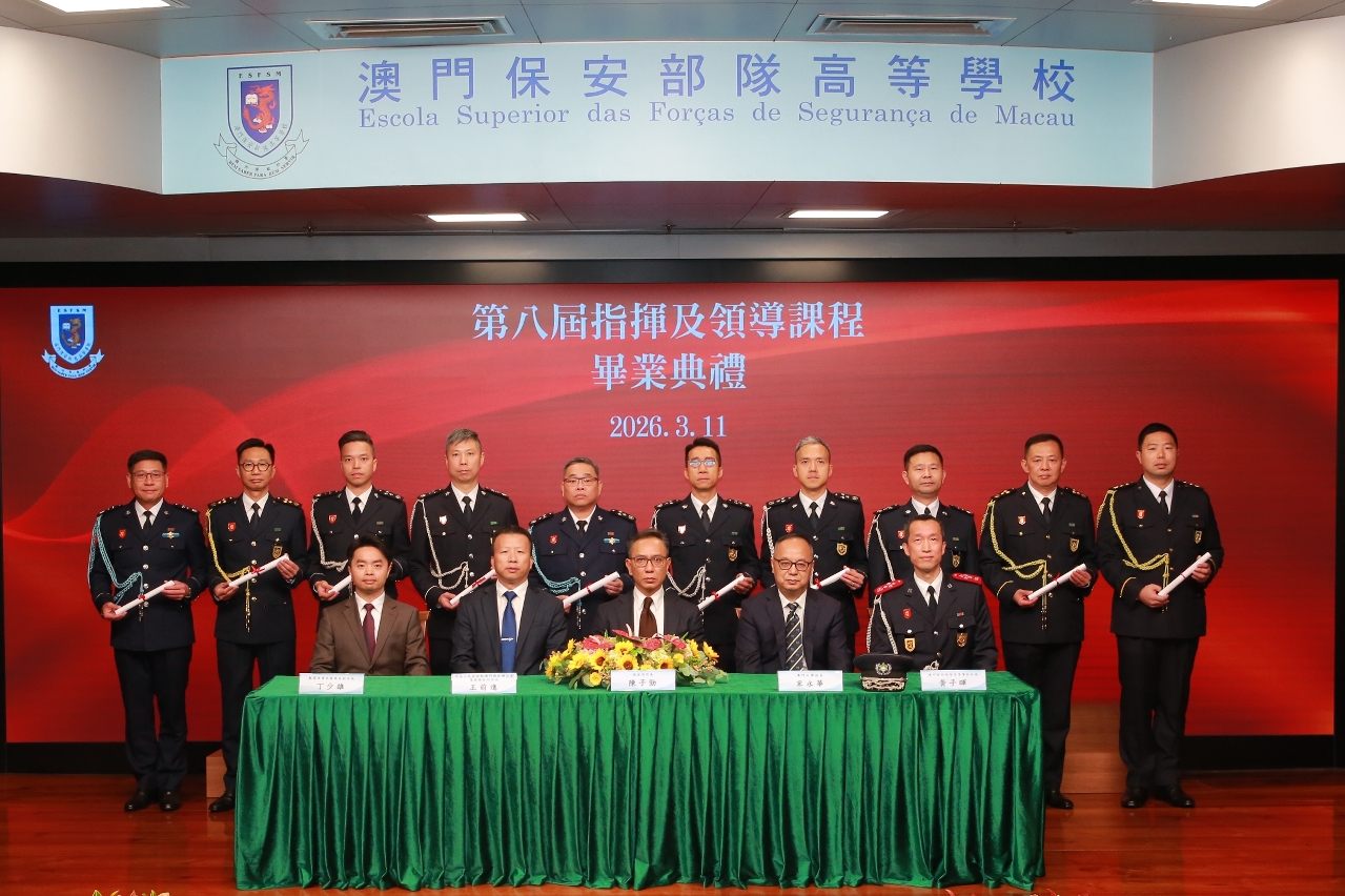 3月11日上午,澳門保安部隊高等學校(下稱“保安高校”) 舉行“第八屆指揮及領導課程及第十八屆警官/消防官培訓課程畢業典禮暨就職儀式”。典禮由保安司司長陳子勁主禮,中聯辦警聯部部長王前進、警察總局局長梁文昌、澳門海關關長何浩瀚、中國人民解放軍駐澳門部隊副參謀長劉歡、澳門大學校長宋永華、教育及青年發展局副局長丁少雄,以及保安司轄下部門領導等嘉賓出席,共同見證畢業學員的榮耀時刻。