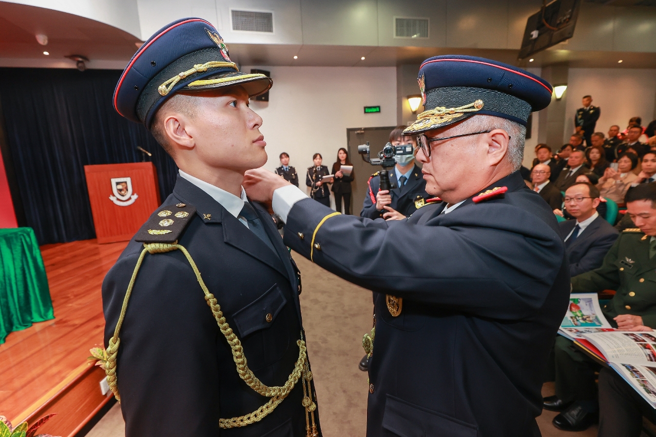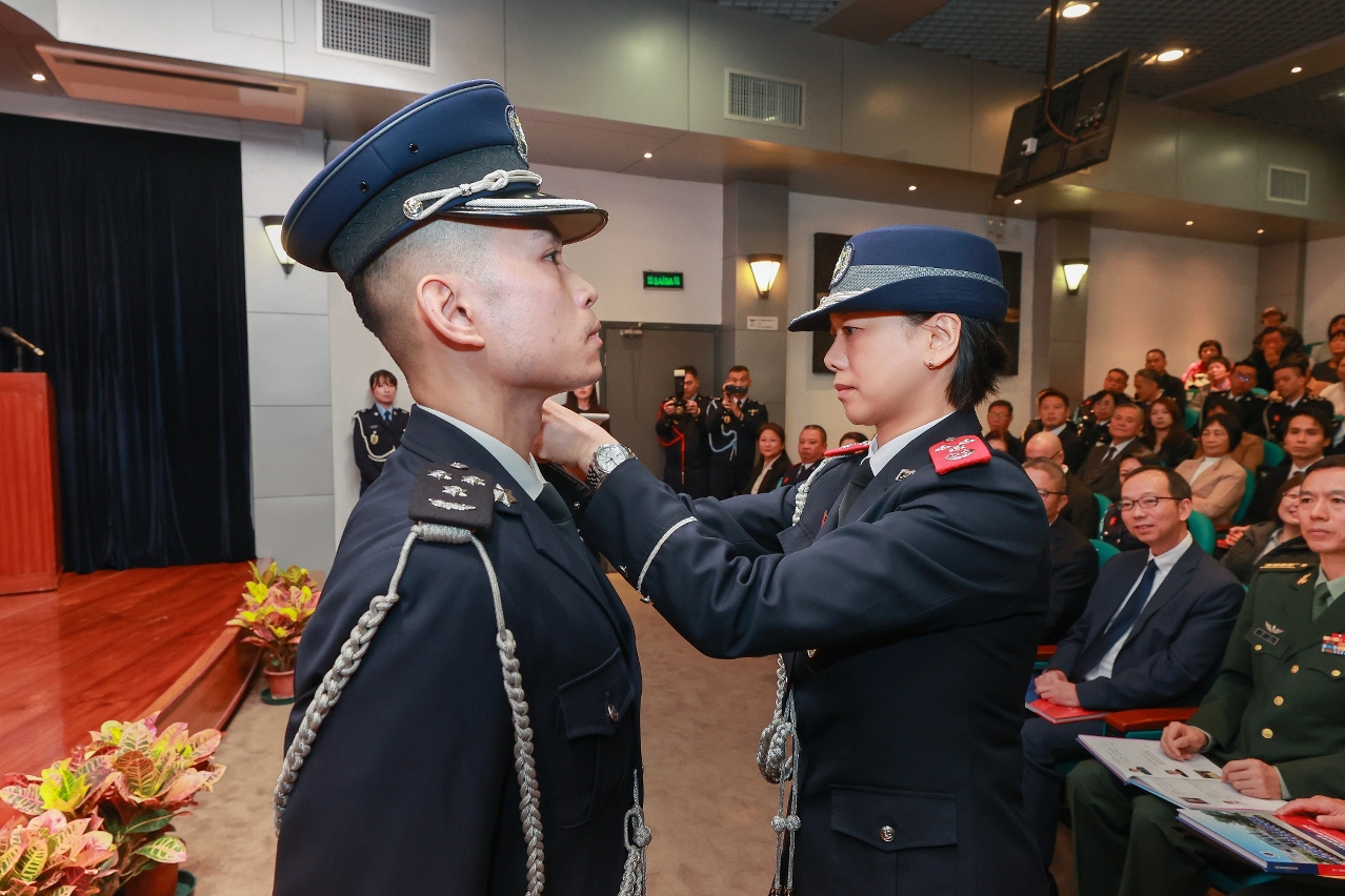 及後,進行副警司及副一等消防區長就職儀式,在眾嘉賓見證下,由治安警察局和消防局領導為畢業學員逐一佩戴肩章,象徵使命在肩,須勇擔職責,儀式莊重嚴謹,標誌人員展開職業生涯新里程。